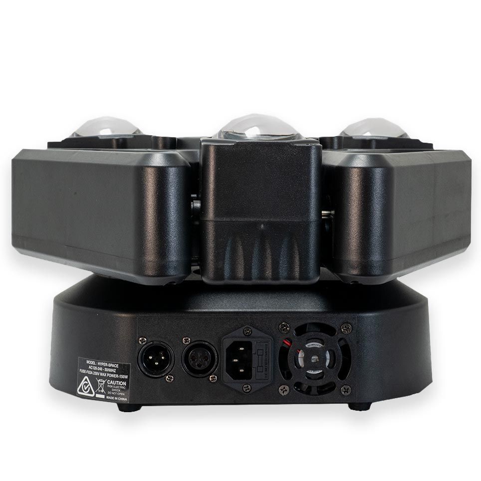 The AVE HYPER-SPACE Multi-Effect Moving Head Light with SMD LED Strip is a compact, 150 W powerhouse that combines 15 × 10 W RGBW LEDs, high-speed white strobes, a 192-pixel addressable SMD strip, and integrated red and green lasers to create rich colour washes, dynamic chases, and striking mid-air effects for clubs, touring rigs, and production setups. Its triple independent beam motors with full 360° pan deliver panoramic sweeps, while precise control is available via 24-channel DMX, Auto, Sound-Active, and Master/Slave modes, supported by an intuitive four-button menu, dimmable display, and macro programming. Built for reliability on the road, the HYPER-SPACE features universal 100–240 V input, internal presets that store settings, protective circuitry, and on-board factory reset, making it a versatile, visually immersive fixture for professional lighting designers.
